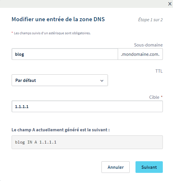 Puis, accédez à l'interface de gestion de votre nom de domaine et définissez une nouvelle entrée DNS de type A qui pointera sur l'adresse IPv4 publique de votre modem (1.1.1.1). Vous pouvez prendre comme nom de sous-domaine : blog.mondomaine.com. Vous devriez avoir quelque chose de similaire (ici chez OVH) :